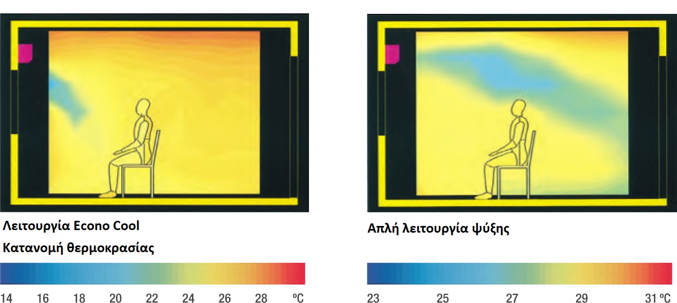 Η λειτουργία Econo Cool είναι μια έξυπνη λειτουργία ελέγχου θερμοκρασίας, η οποία προσαρμόζει την ποσότητα του αέρα που κατευθύνεται στο σώμα με βάση τη θερμοκρασία εξόδου του αέρα. Η επιλεγμένη θερμοκρασία μπορεί να αυξηθεί έως και 2ο χωρίς καμία διαφοροποίηση στο αίσθημα άνεσης, επιτυγχάνοντας έτσι 20% κέρδος στην εξοικονόμηση ενέργειας.